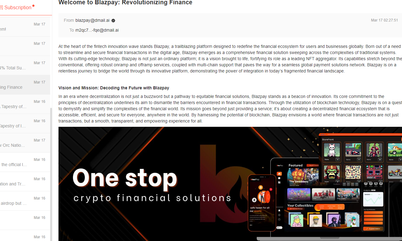 The integration of Blazpay into the Dmail Subscription Hub marks a significant stride toward enhancing accessibility and efficiency within the crypto finance sector. By leveraging this partnership, Blazpay not only expands its reach to a broader audience but also aligns with Dmail's mission of fostering innovation and community growth within the blockchain space.