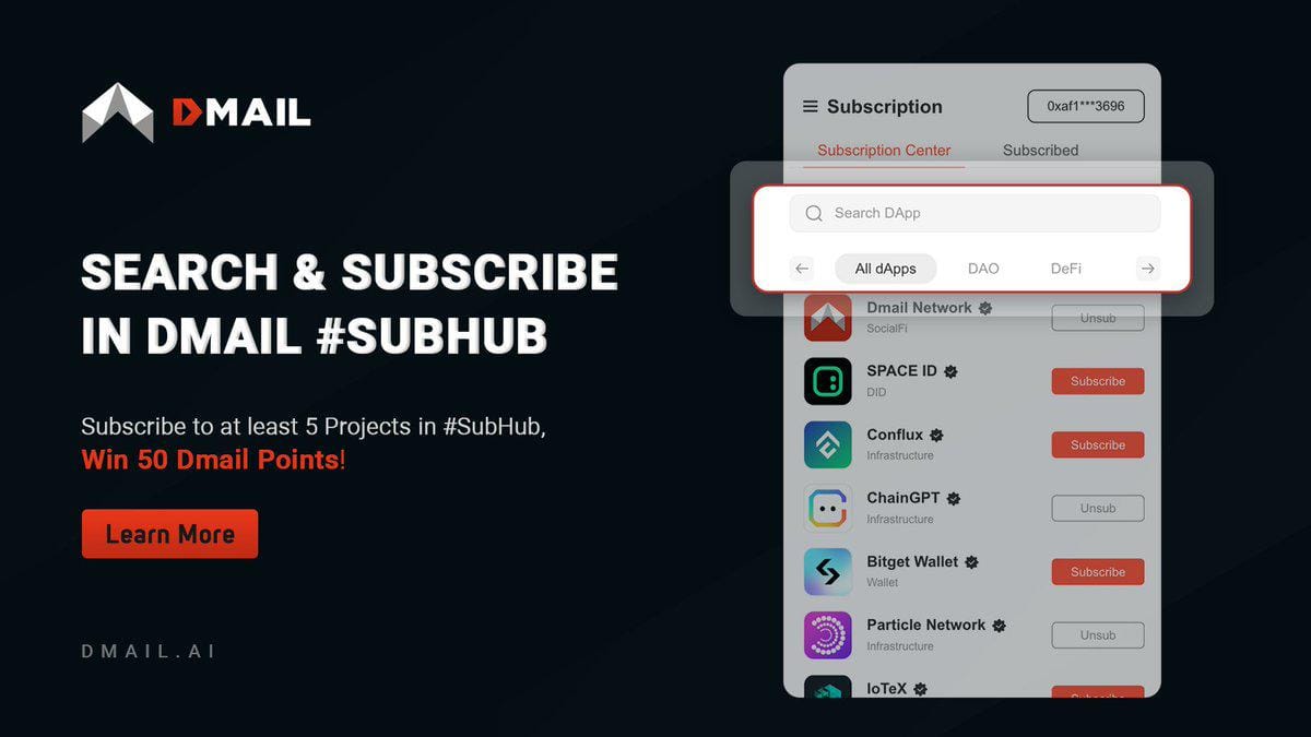 - Introduced a search feature in Dmail Subhub, rewarding users with additional points for subscribing to multiple projects.