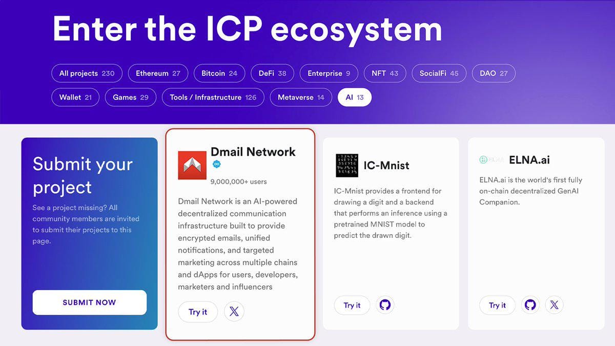 13. Dmail Network has been listed as a featured project in the AI section of the ICP ecosystem!