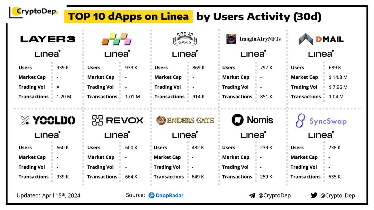 15. According to CryptoDep data, Dmail has once again become one of the top 5 active projects in the Linea ecosystem.