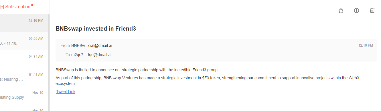 The synergy between Dmail's cutting-edge web3 communication protocols and BNBswap’s content expertise creates an unparalleled ecosystem for information sharing. Users can now receive the latest updates, market analysis, and crypto guides straight to their wallets and DIDs, fostering a more informed and connected blockchain community.