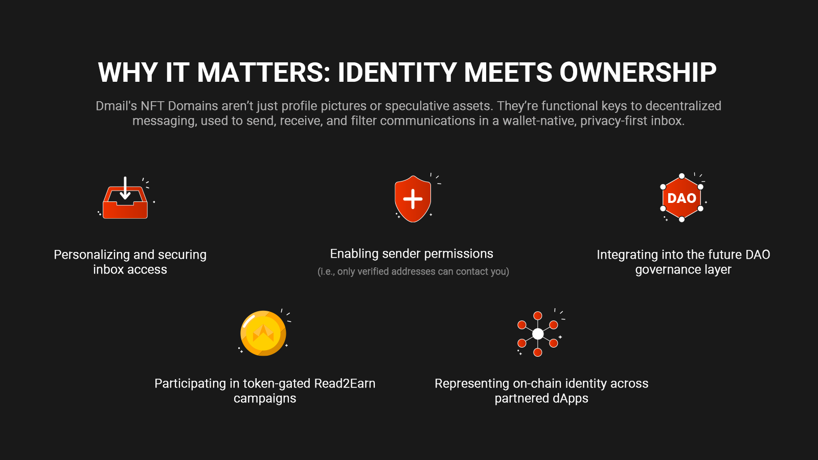 Dmail's NFT Domains aren’t just profile pictures or speculative assets. They’re functional keys to decentralized messaging, used to send, receive, and filter communications in a wallet-native, privacy-first inbox.