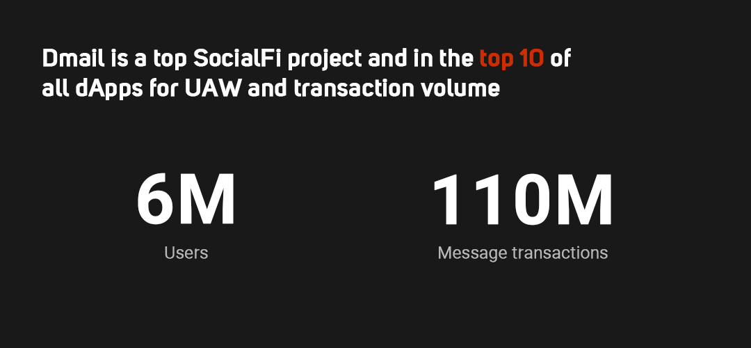 According to the highly respected analytics platform Dappradar, Dmail is a top SocialFi project and in the top 10 of all dApps for UAW and transaction volume. This is despite the majority of Dmail's contracts not being accounted for; the figure is actually much higher.
