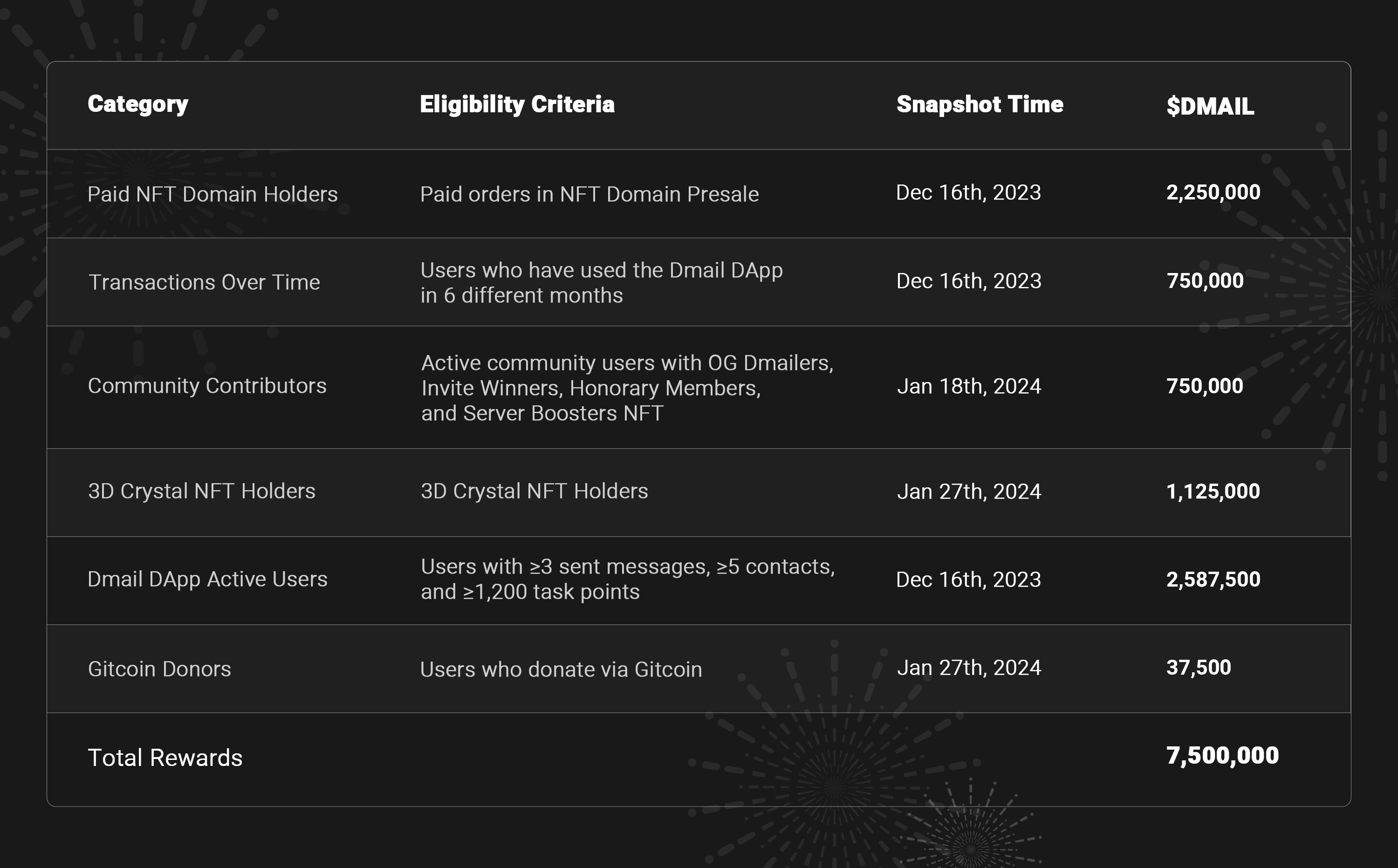 The standard and design of the airdrop are primarily aimed at rewarding early adopters and to the greatest extent, preventing Sybil attacks and airdrop hunters. The 7.5 million $DMAIL tokens allocated towards the Airdrop Rewards are divided into several categories, each representing different communities and users. Each qualified address holder can claim their corresponding $DMAIL airdrop rewards; if a user meets the eligibility criteria for multiple categories, then the claim amount for the airdrop will be the sum of the rewards from each category.