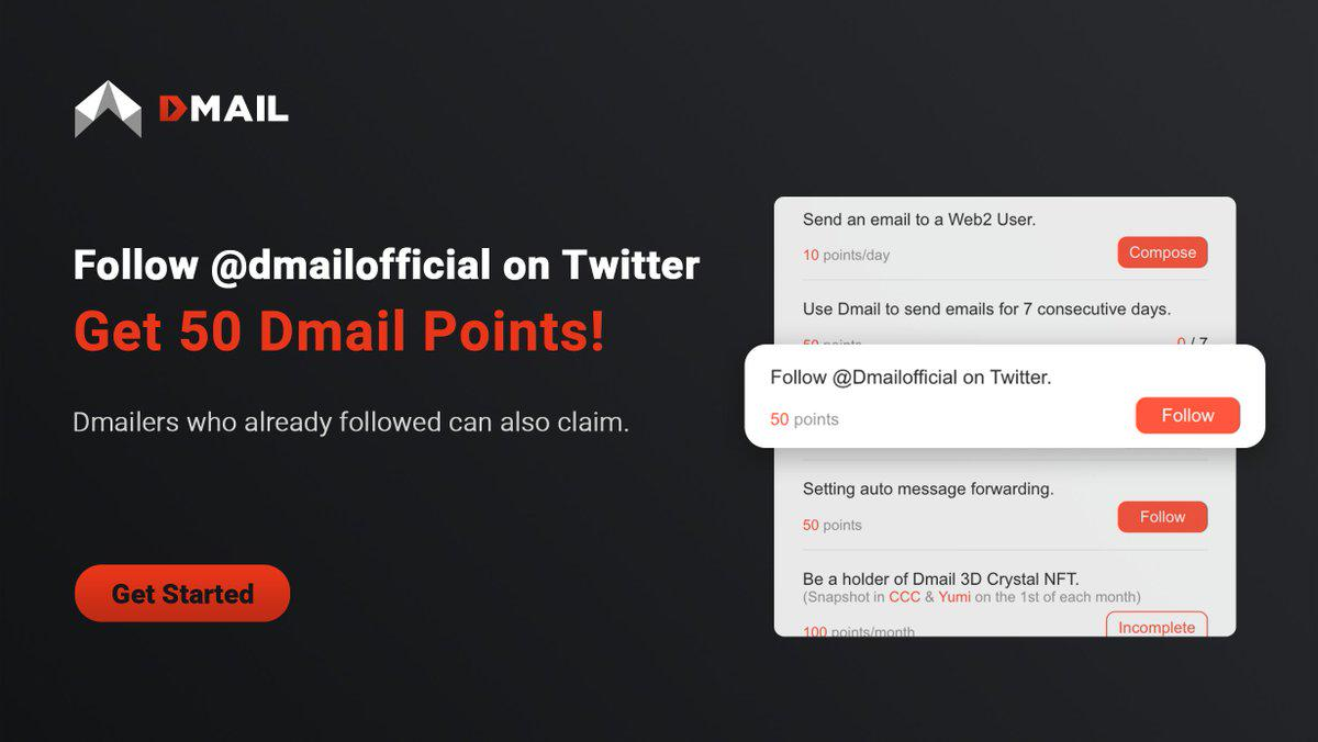 10. Dmail launched a new points activity, where users can follow Dmail's official Twitter account to receive 50 Dmail points.