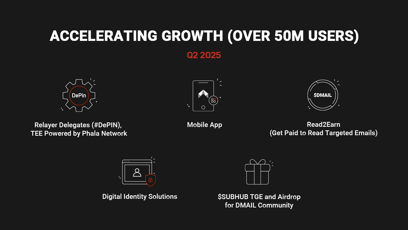 Imagine having a secure, blockchain-based identity that you can use across the Web3 ecosystem. Our digital identity services allow users to establish trust and interoperability, ensuring seamless integration with decentralized applications while maintaining complete control over their personal information. - $SUBHUB TGE and Airdrop for DMAIL Community: