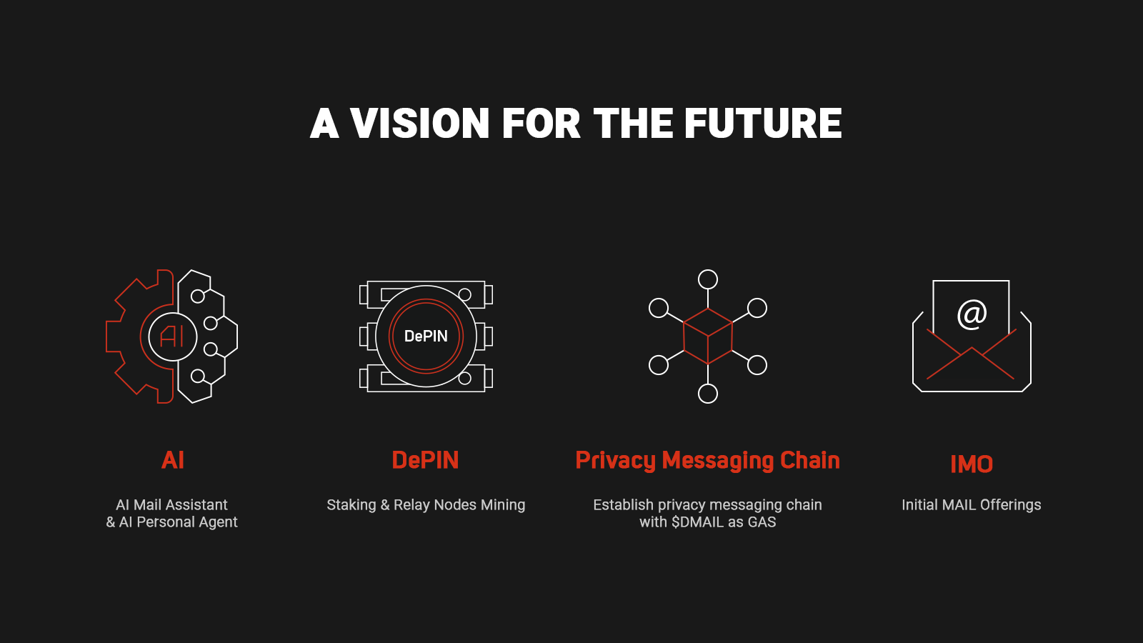 Looking forward, Dmail Network is set to embark on ambitious projects involving AI, DePIN functionality, and the development of a privacy messaging chain. This includes the development of innovative features like the AI Mail Assistant, AI Personal Agent and AGI, as well as the introduction of Staking & Relay Nodes Mining and Initial MAIL Offerings (IMO).