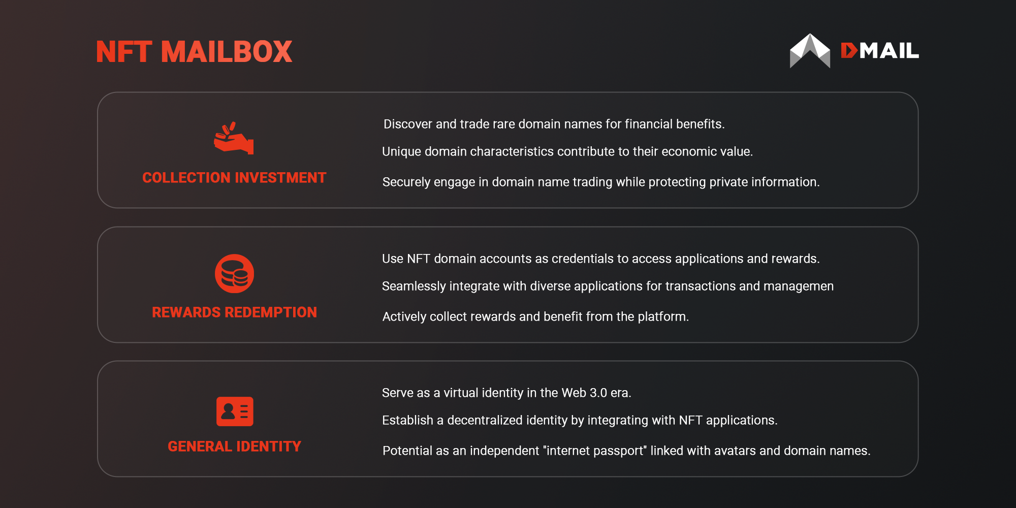 Dmail's NFT (Non-Fungible Token) mailbox offers a distinctive proposition, providing users with not only a novel concept but also a range of benefits and possibilities within the Web 3.0 era. Beyond its essential application, the NFT domain account holds three key aspects: collection investment, rewards redemption, and general identity.