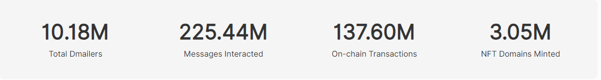 Dmail Network's accomplishments are notable, with over 225 million transactions processed and expansion across 24 blockchain networks, showcasing our scalability and interoperability. This wide-ranging support underscores Dmail's capability to facilitate seamless communication across diverse blockchain ecosystems.